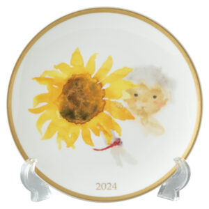 2024年没後50年を迎える年に28枚目となるいわさきちひろイヤーズプレートは「ひまわりとあかちゃん」。やわらかくふっくらとしたあかちゃんと大きく描かれたひまわりは、水彩のにじみや濃淡を駆使して描かれています。