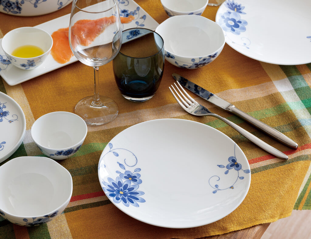 特徴のある青い梅の花を大胆にコラージュした、普段使いしやすい食器です。