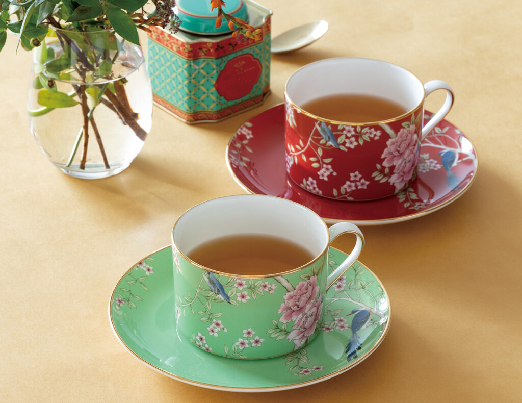 さわやかなブルーカラーをバックに、幸福を運ぶといわれている青い鳥や、新しい出会いや変化の訪れを表す蝶が飛び交い、鳥たちの歌や花々の香りがテーブルから立ち上がってくるようなコレクションです。
