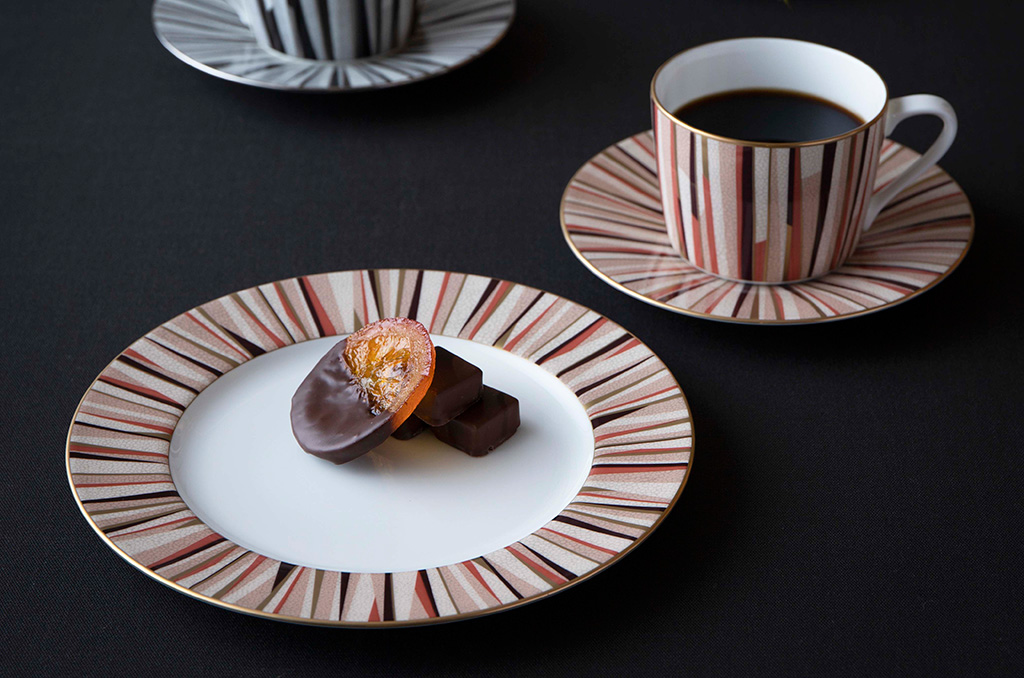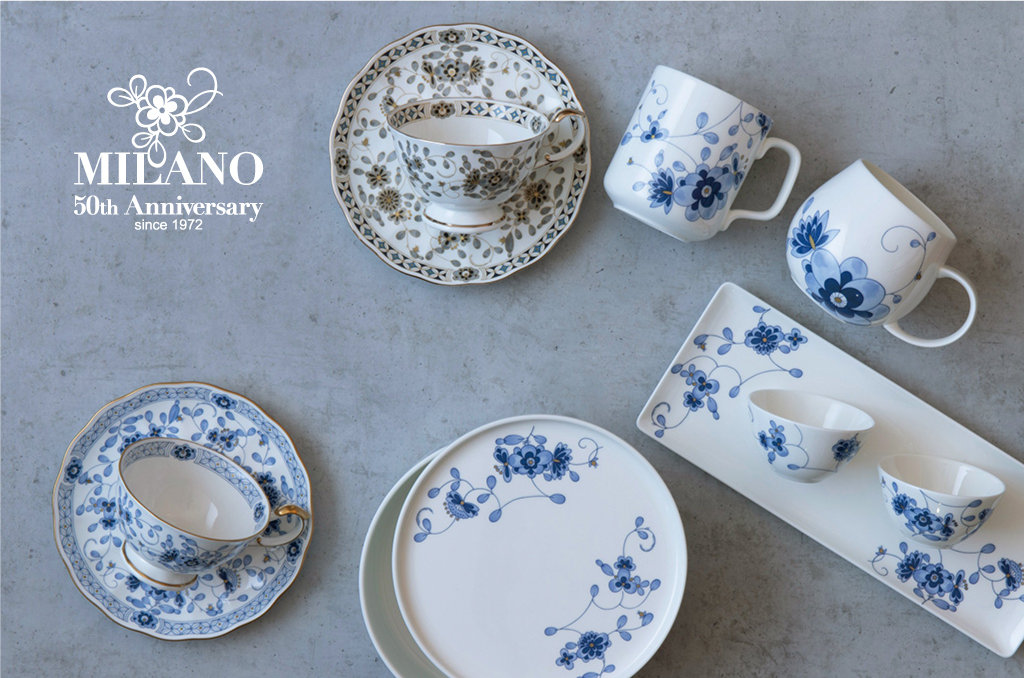 1972 年、ある展示会で1 客のカップ&ソーサーが若い女性たちに次々と手に取られ大人気となっていました。それがミラノでした。その様子を見ていた企画担当者が「これはいける!」と、オープンラインへと品目を拡大したことで、ミラノは日本の洋食器として広く知られることとなりました。更紗調の梅の花にブルーの濃淡で抑揚をつけた装飾と、絶妙に簡略化された菊の花の形状は、日本の伝統的なモチーフでありながら洋食器という新たな形になじみ、日本の洋食器として時を超えて人々を魅了しています。