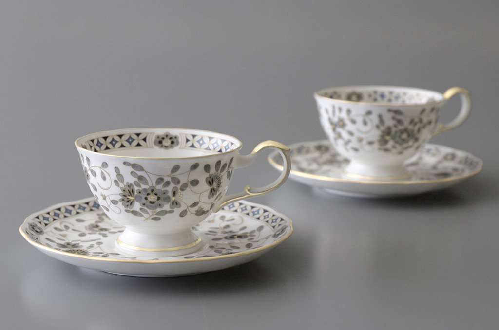 シックなブラックと豪華な輝きが特徴のホワイトゴールドの金彩を施したカップ&ソーサーは、繊細な黒の濃淡と軽やかに輝くホワイトゴールドがモダンなティータイムを演出いたします。ハンドルをよく見るとミラノとは異なる輝きを楽しむことができます。