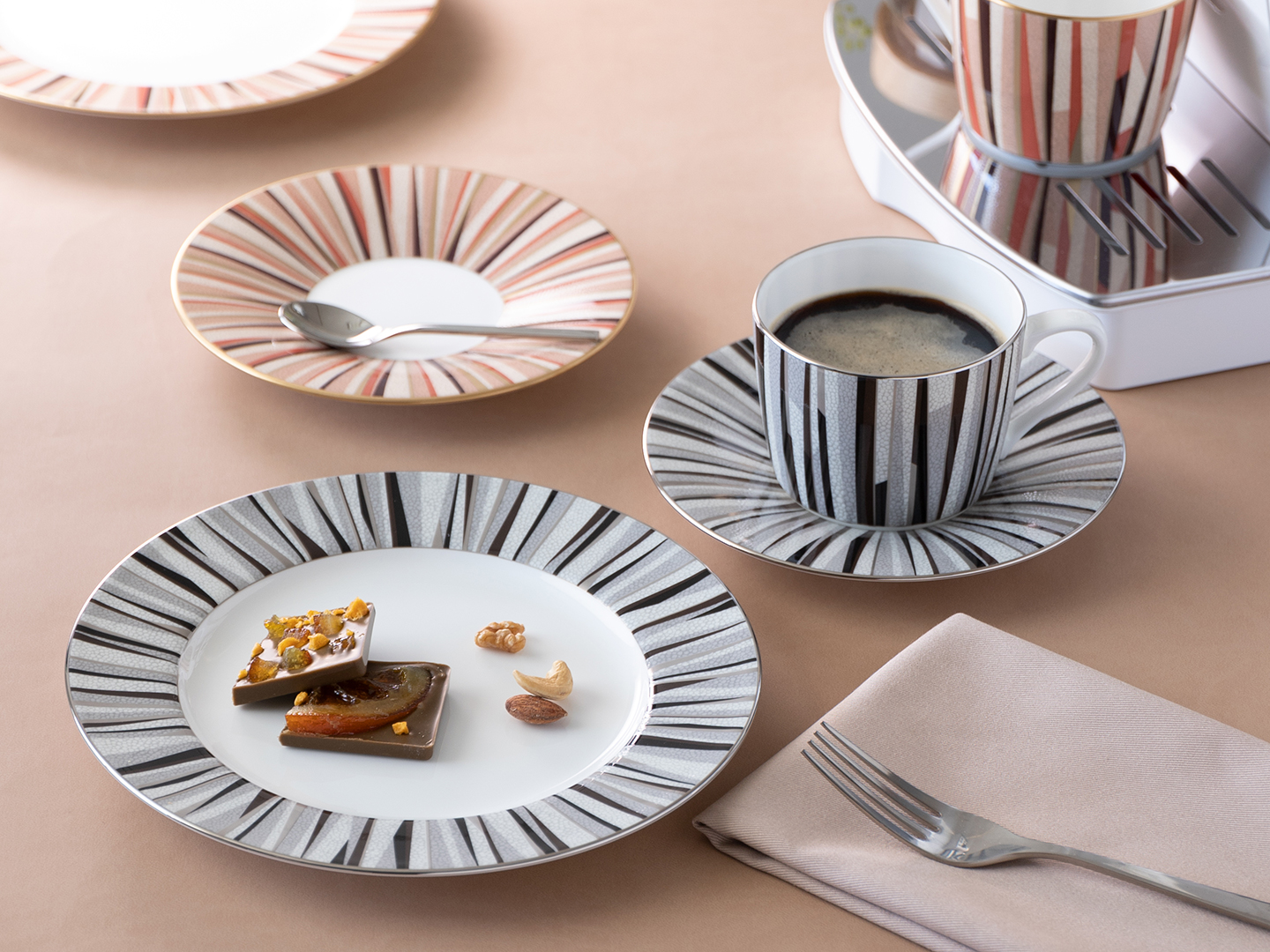 ボーンチャイナの白を基調にモダン且つシンプルなデザインとシャグリーン(鮫肌)調の表面仕上げが、落ち着いた雰囲気のテーブルウェアです。