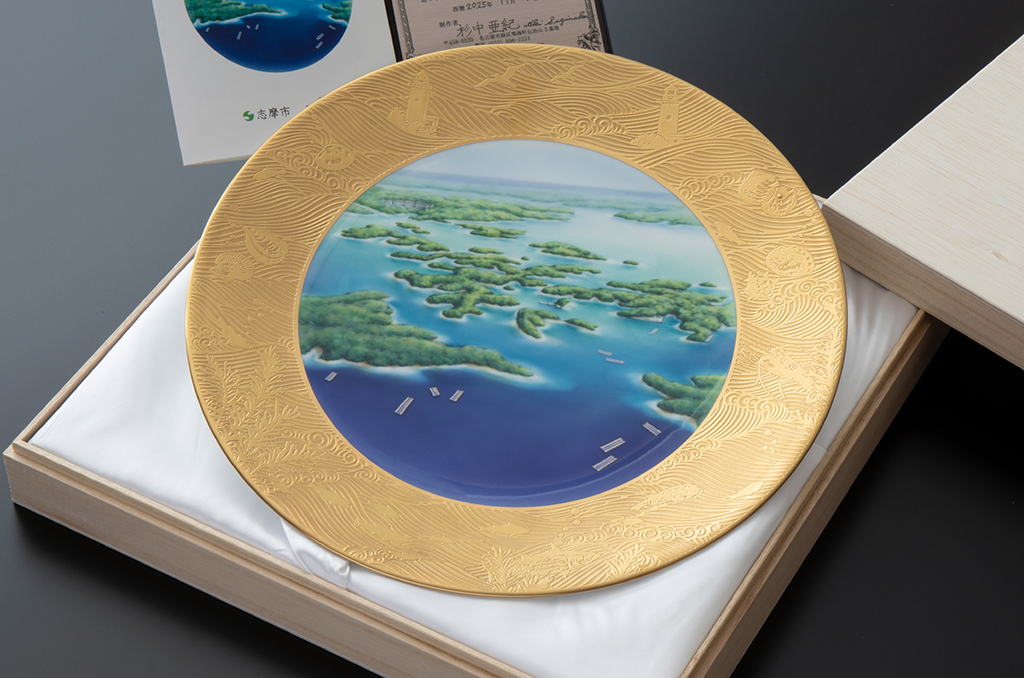 縁部分には、中央の風景を引き立てる波をベースに、志摩市の象徴である灯台や特産物を描き込み、さらに金装飾はサンドブラスト技法や盛を用いて、繊細かつ圧巻の立体表現に仕上げました。