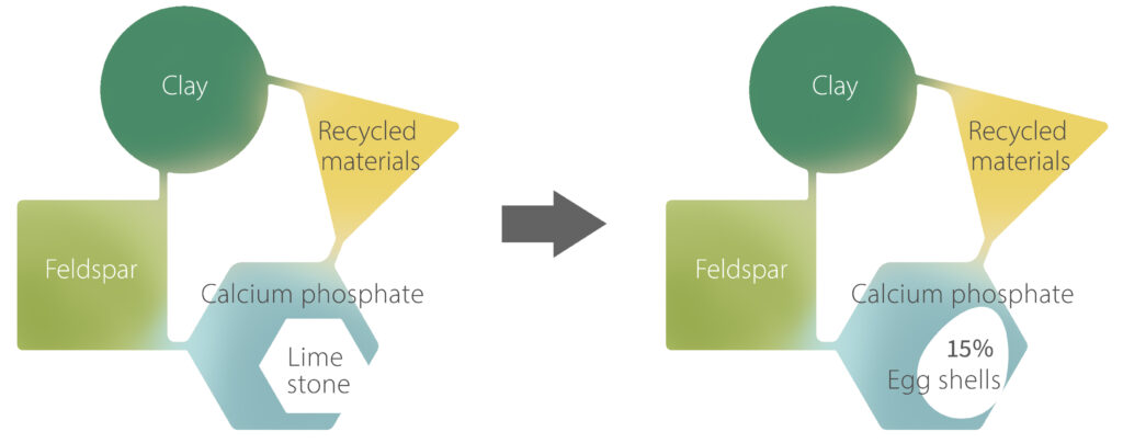 Eggs and bone china share a common element: calcium. NARUMI Bone China uses over 40% calcium phosphate (bone ash), while eggshells are composed of over 90% calcium carbonate. Applying decades of grinding and firing expertise from bone china production, we have turned eggshell byproducts into an upcycled material. We have already begun integrating it into the bone china body across our production line, and we will gradually increase its share over time.